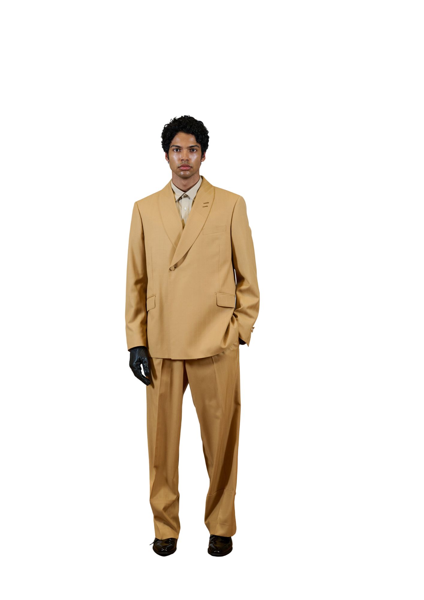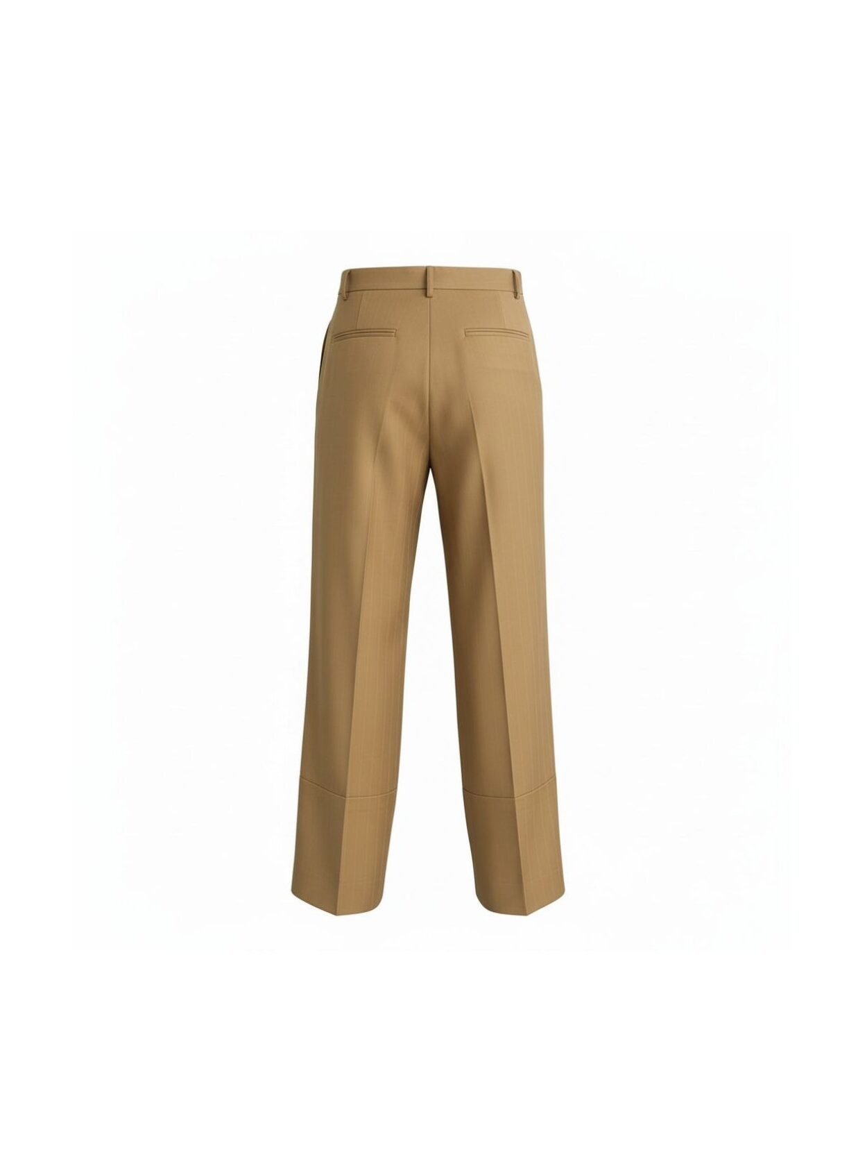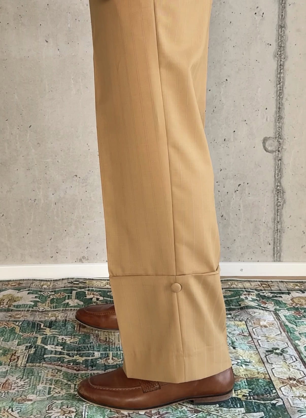 Scirocco trousers — cut from the same warm sand pinstripe, they sit clean on the waist and fall straight through the leg for an easy, confident line.